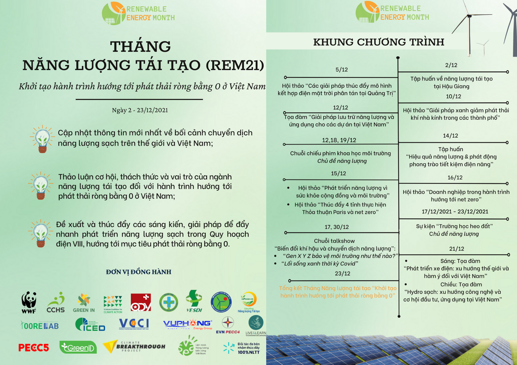 • GreenID trân trọng gửi các thành viên Tờ thông tin giới thiệu về chương trình và đường link để đăng ký tham gia các sự kiện trong Tháng Năng lượng tái tạo. Các thành viên vui lòng chia sẻ thông tin đến các đối tác, cộng đồng có quan tâm cùng tham gia chương trình để chúng ta cùng thúc đẩy thông điệp "Khởi tạo hành trình hướng đến phát thải ròng bằng 0". Ban điều phối rất mong các thành viên truyền thông để chương trình được mở rộng.